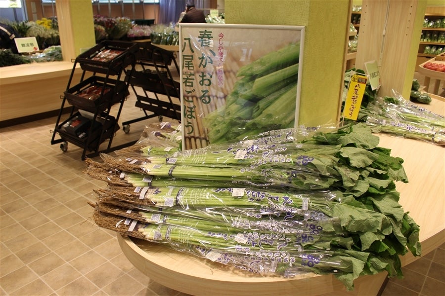 「若ごぼう」と呼ばれる八尾の葉ごぼうは、短い根に長い茎と大きな葉が特徴です。 他地域の葉ごぼうとの違いは、自家採取の種を代々使っていること、葉刈りを行うこと、伝統の「矢束」で出荷しています。また、平成25年に地域団体商標「八尾若ごぼう」として登録されています。根だけ食べる普通のごぼうと異なり、葉、軸、根まで丸ごと食べることができます。 シャキシャキとした歯ごたえと豊かな香り、ほろ苦さのある、春の旬を感じられる貴重な野菜として食されています。炒め煮やかき揚げ、サラダ、スパゲティなど多彩な料理に使えます。