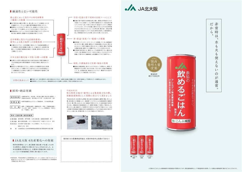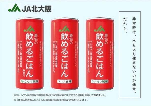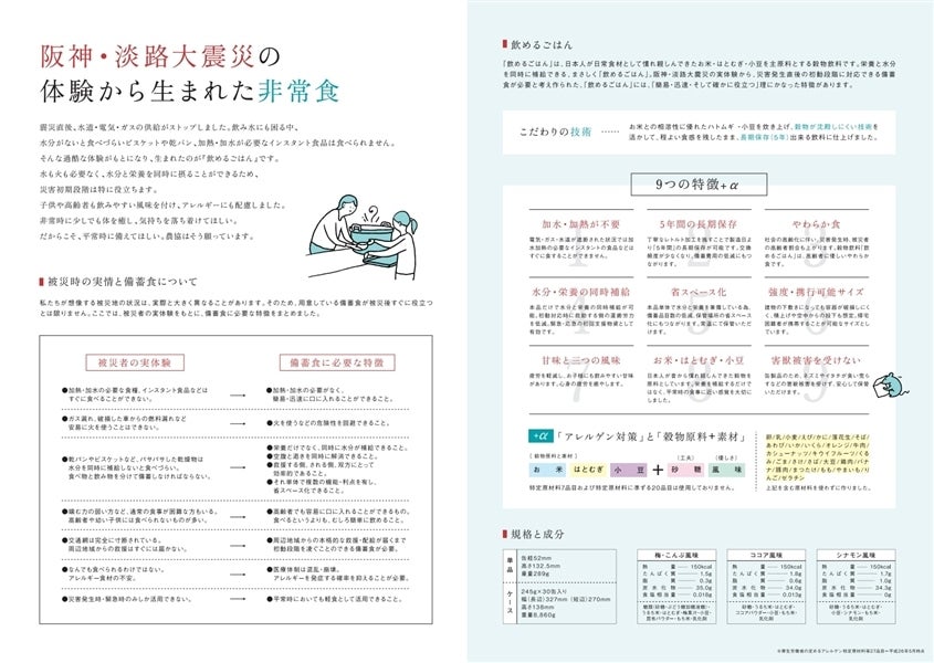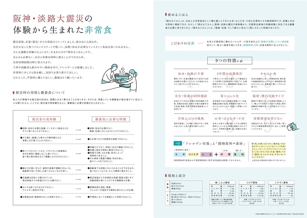 「飲めるごはん」は、日本人が日常食材として慣れ親しんできたお米・はとむぎ・小豆を主原料とする穀物飲料です。 阪神大震災の実体験から、災害発生直後の初動段階に対応できる備蓄食が必要と考え作られました。