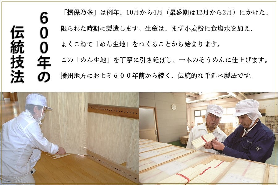 素麺づくりの際、端部分として切り落とされる部分ですが、揖保乃糸ならではのコシの強さと小麦の風味をしっかりと楽しめる人気の商品です。