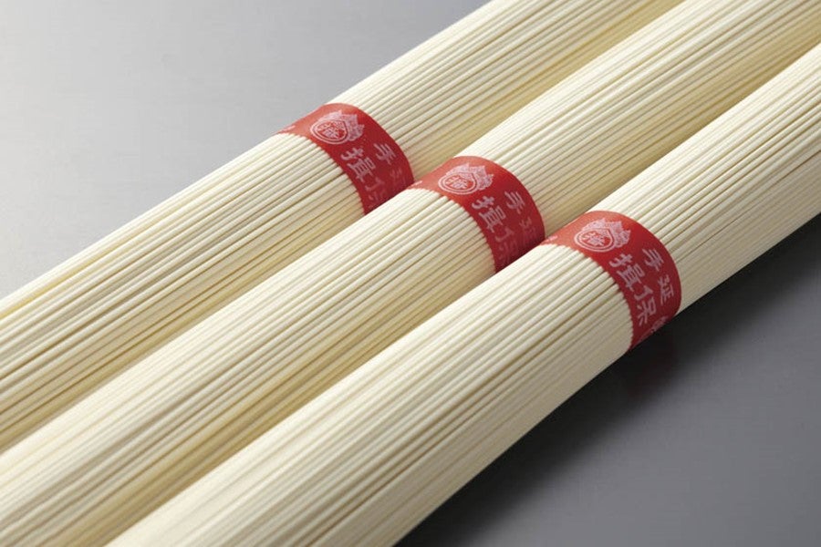 「揖保乃糸」の中で歴史のある赤帯の手延そうめん揖保乃糸上級品は、全生産量のおよそ80%を占め、10月から翌年4月の間に製造し、小麦粉と塩水を練り合わせ、「より」と「熟成」を幾度も繰り返し、徐々に細くし手間隙かけて製造します。