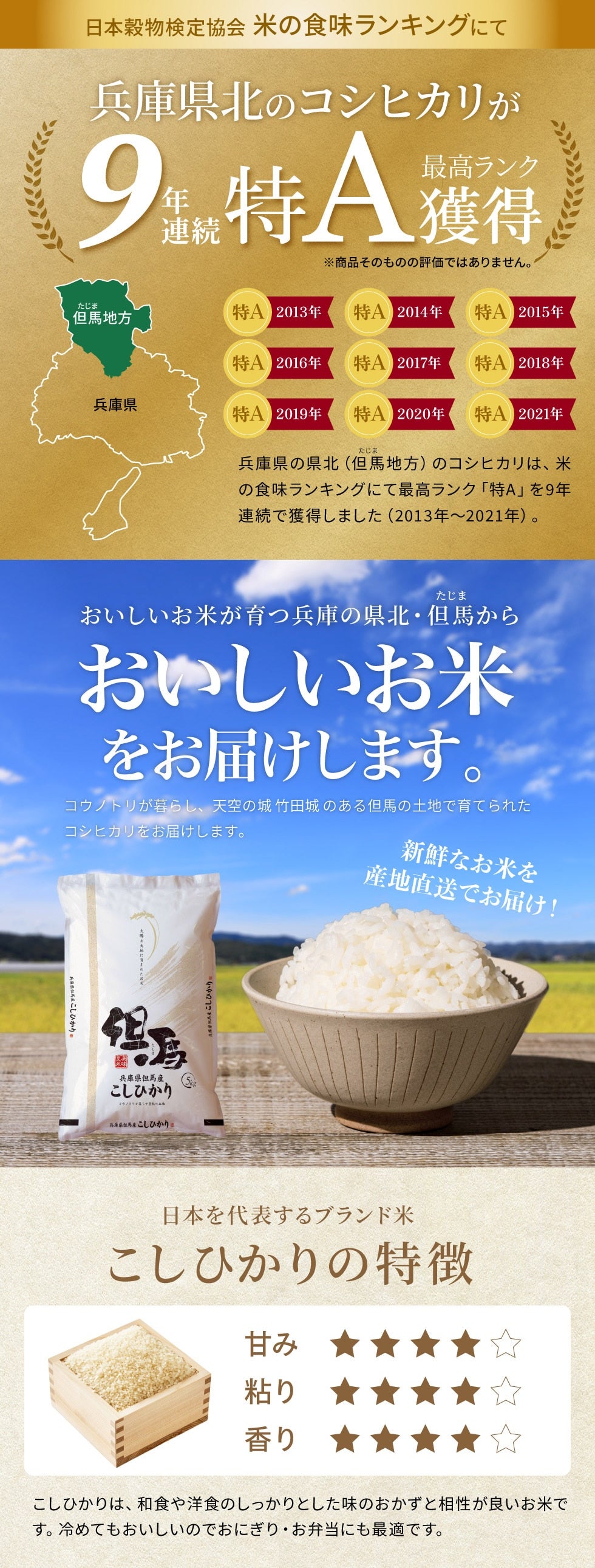 「但馬こしひかり」は、「コウノトリの郷」として知られる豊岡市や、「天空の城」竹田城がある朝来市など、たじま各地で栽培された銘米・コシヒカリです。