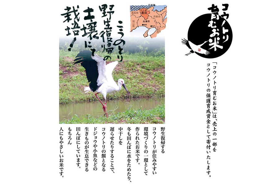 「コウノトリ育むお米」は、売上の一部をコウノトリの保護育成資金として寄付いたします。