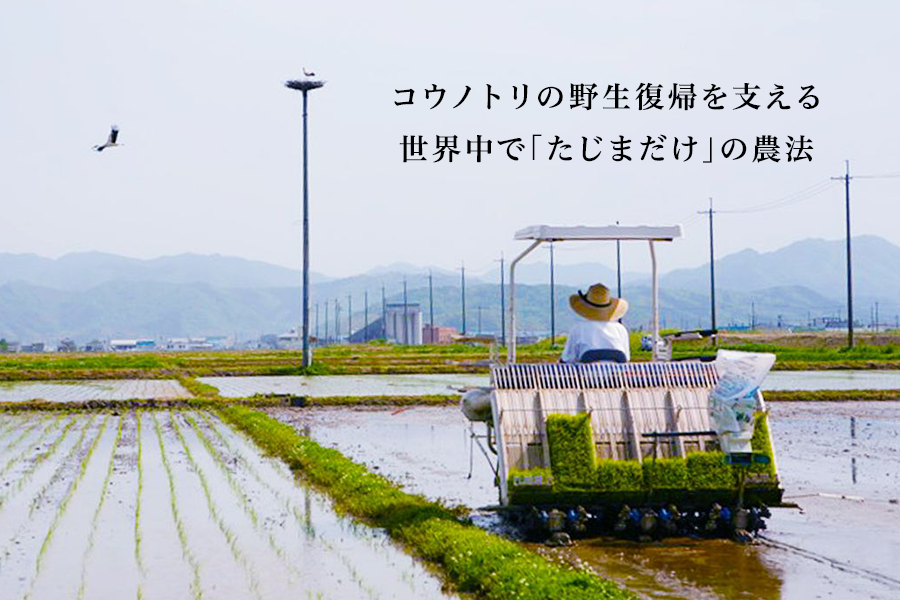 コウノトリをもう一度日本の空へ戻そうと決意し、農薬の削減、化学肥料の不使用、生きものが増えやすい水管理を行ったお米作りが始まりました。(コウノトリ育む農法)
