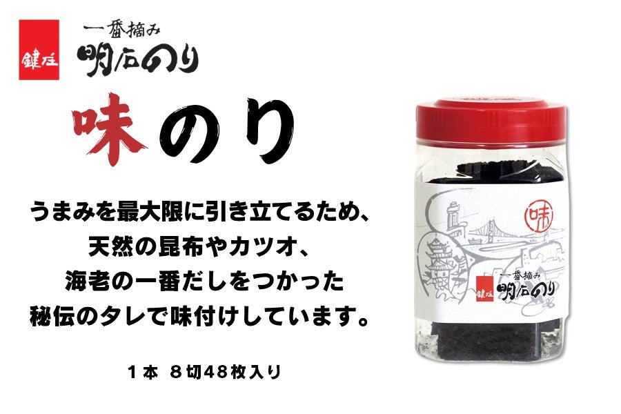 鍵庄の看板商品「一番摘み 明石のり」味のりは、うまみを最大限に引き立てるため、天然の昆布やカツオ、海老の一番だしをつかった秘伝のタレで味付けしています。