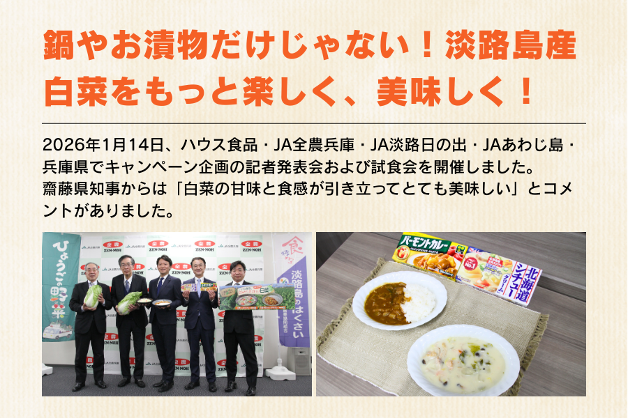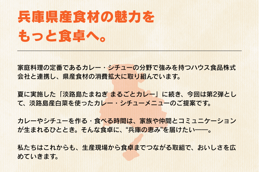 JAグループ兵庫は、家庭料理の定番であるカレー・シチューの分野で強みを持つハウス食品株式会社様と連携し、兵庫県産食材の消費拡大に取り組んでいます。