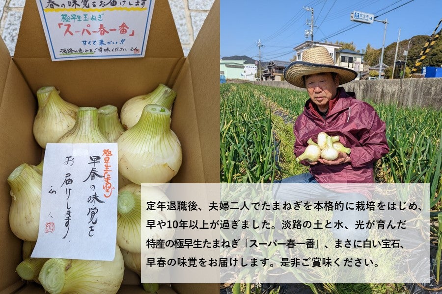 定年退職後、夫婦二人でたまねぎを本格的に栽培をはじめ、はや10年以上が過ぎました。 淡路の土と水、光が育んだ特産の極早生たまねぎ「スーパー春一番」は、まさに白い宝石。 早春の味覚をお届けしますので、是非ご賞味ください。
