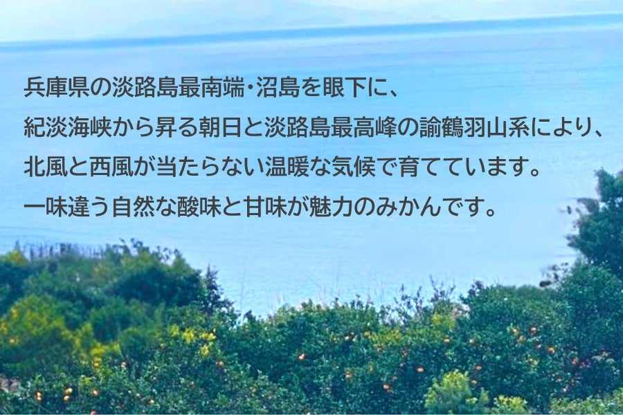 兵庫県の淡路島最南端・沼島を眼下に、紀淡海峡から昇る朝日と淡路島最高峰の諭鶴羽山系により、北風と西風が当たらない温暖な気候で育てています。