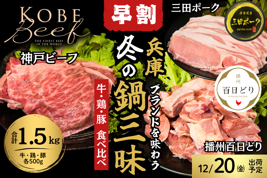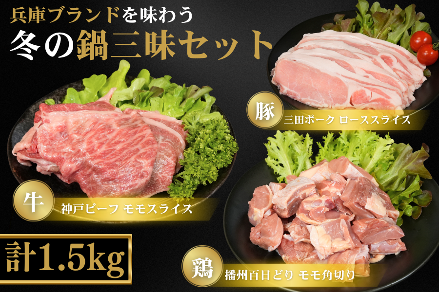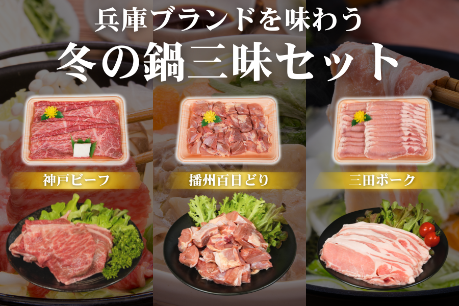 兵庫ブランドの「神戸ビーフ」・「播州百日どり」・「三田ポーク」の3種のお肉を鍋料理に使いやすいカット・量で個包装し、お届けいたします。
