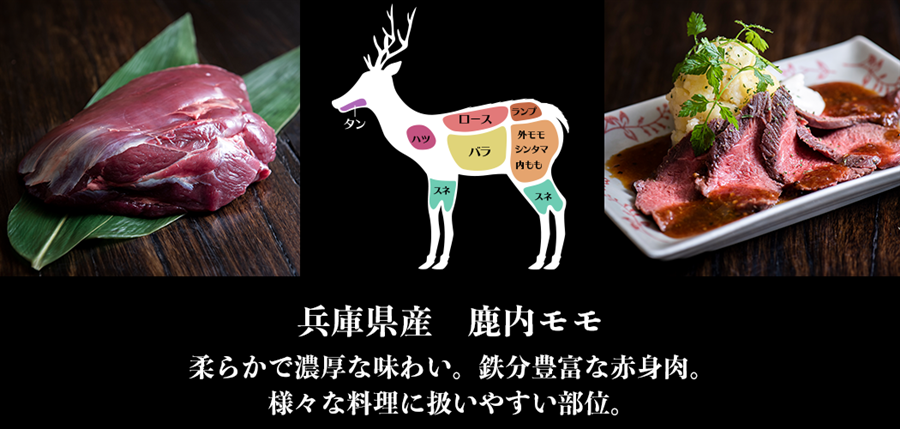 鹿内モモ:柔らかで濃厚な味わい。鉄分豊富な赤身肉。様々な料理に扱いやすい部位