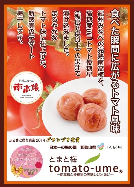 「紀州みなべの南高梅」を、高糖度ミニトマト「優糖星」(糖度8度以上)の果汁で漬け込みました。