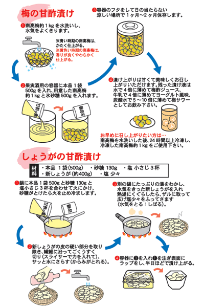 ご家庭で簡単においしい甘酢漬けが作れます。 原材料に梅と相性の良いリンゴ酢を使用しており、まろやかに風味の良い味・香りにしあがります。 しょうがの甘酢漬けレシピも明記しています。 その他に、大根やかぶ、らっきしょうの甘酢漬けにも最適です。