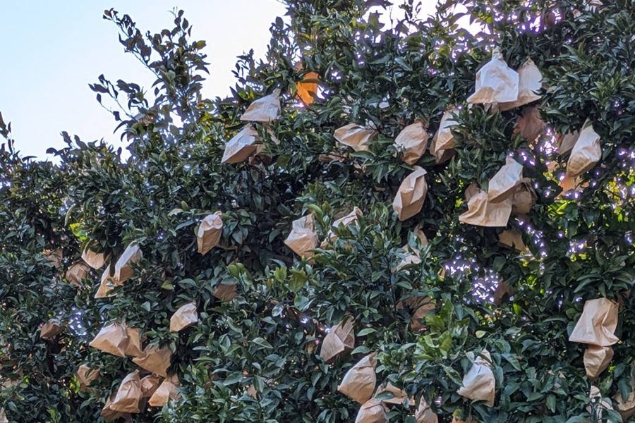 雨風などから実を守るために、ひとつひとつ袋がけをして、丁寧に収穫しています。