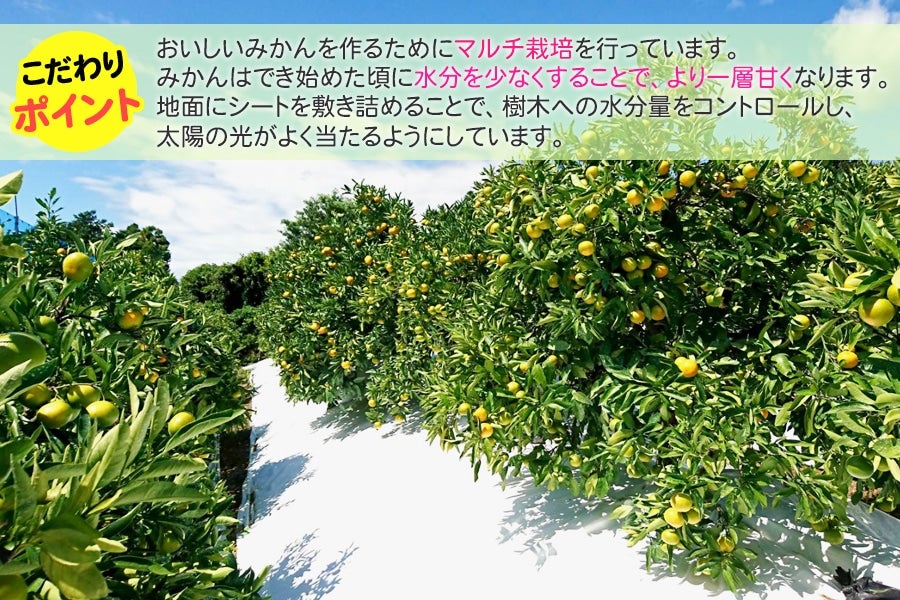 おいしいみかんを作るためにマルチ栽培を行っています。地面にシートを敷き詰めることで、樹木への水分量をコントロールし、太陽の光が良く当たるようにしています。