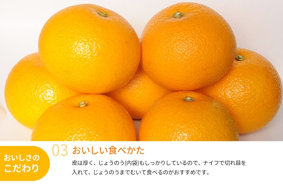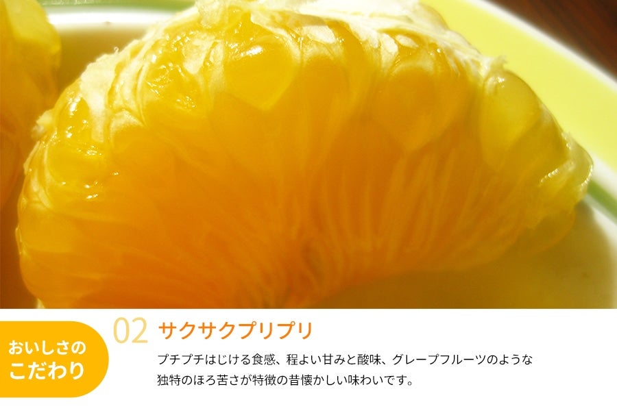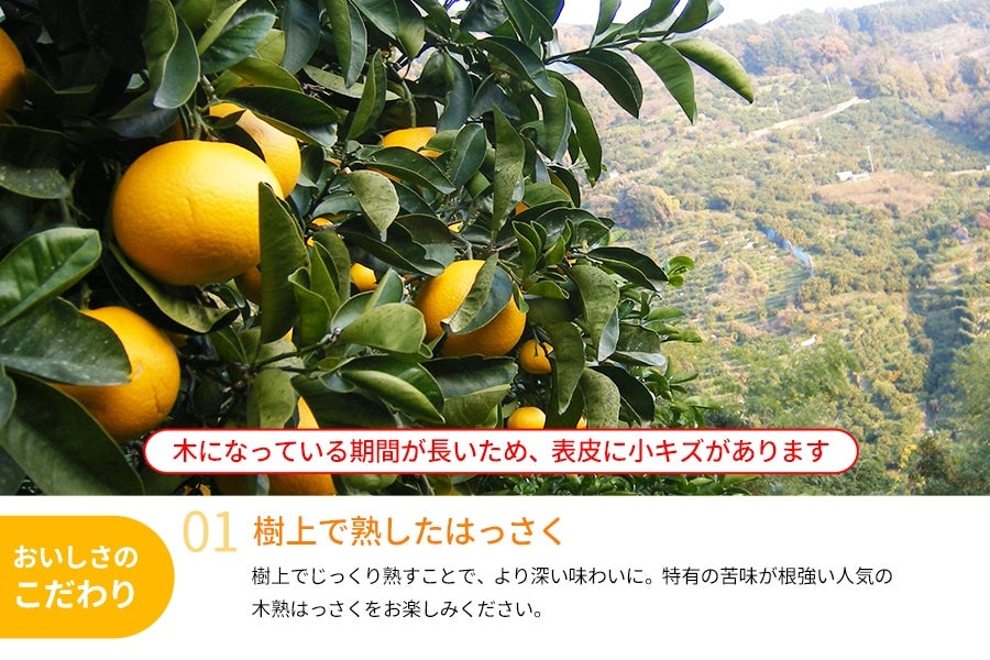 上品な甘さと酸味、そしてグレープフルーツのような爽やかな苦みがクセになるはっさくは、みずみずしい果肉のプリプリ食感が楽しめる柑橘です。昔からのファンも多く、近年人気の甘い柑橘にはない魅力があります。