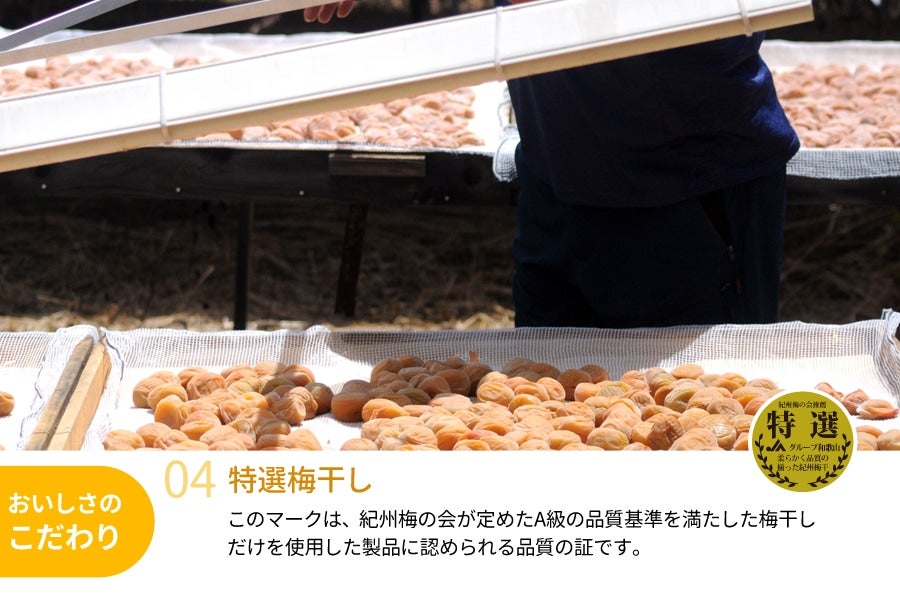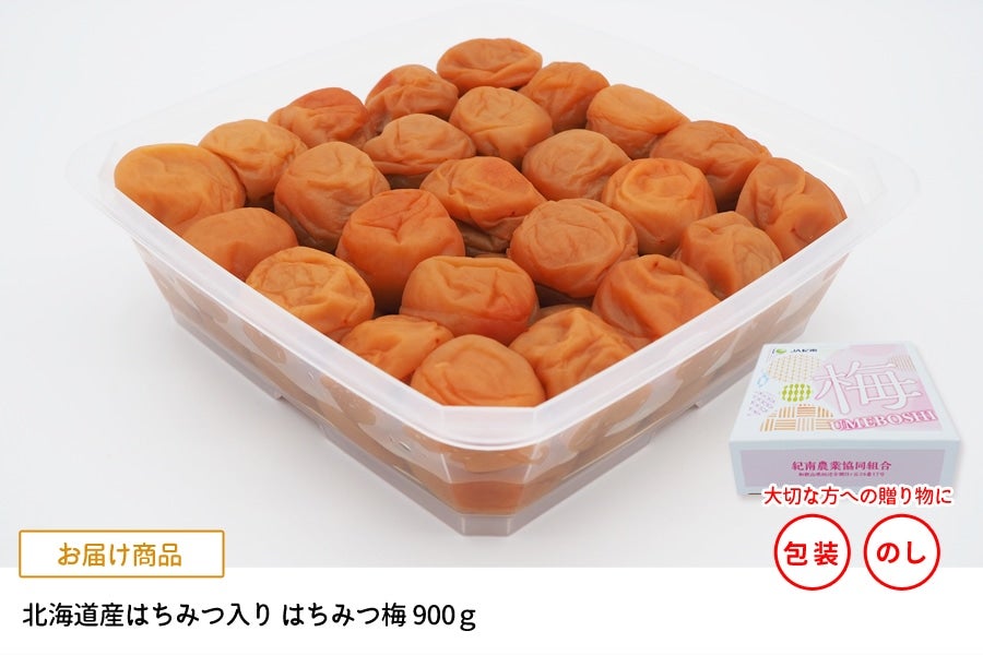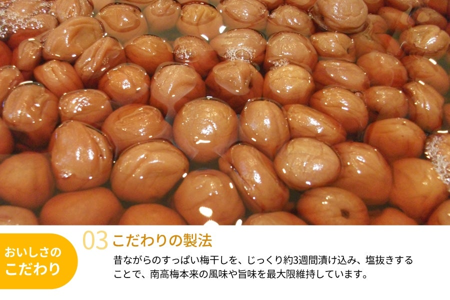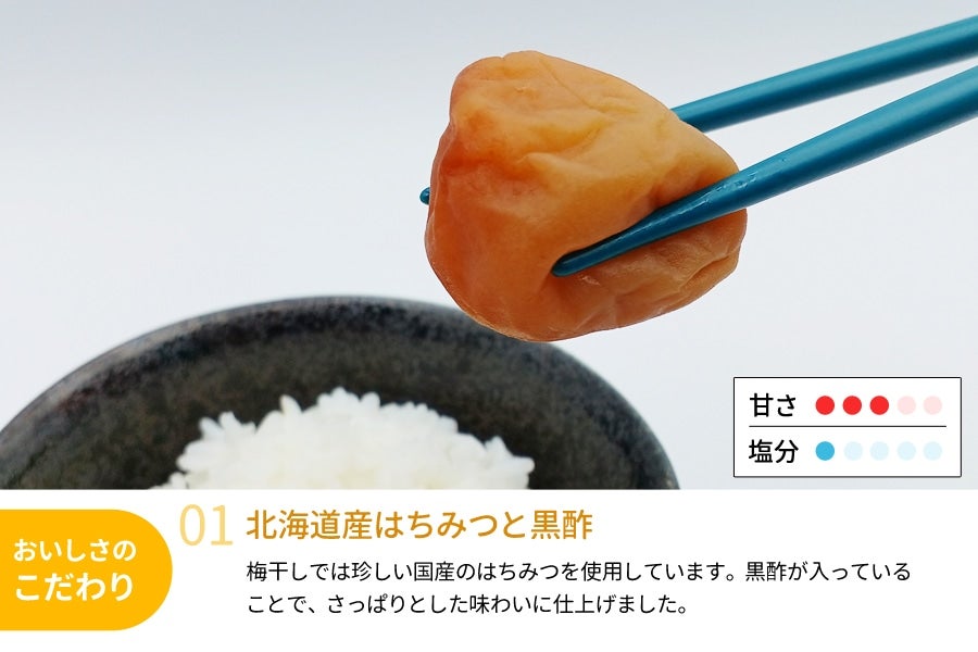 「北海道産はちみつ」と「黒酢」を使用し、うす塩味に仕上げたはちみつ梅干しです。
