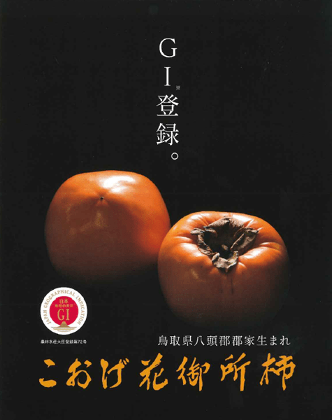 花御所柿は鳥取県の東部、因幡(いなば)地方にのみ栽培され、そのほとんどが八頭町(やずちょう)郡家(こおげ)で生産されている非常に珍しい柿です。  収穫は、一般的な柿に比べて遅く、柿の葉がほとんど落ちてしまい、実が赤く色づく11月下旬から12月中旬に行います。  肉質はち密で果汁が多く、糖度は甘柿の中でも最高ともいわれ、とろけるような味は一度食べた忘れられません。  また、ほんのりと渋みが口に残るのも特徴のひとつです。  鳥取県ならではの名品をぜひお試しください。 こおげ花御所柿は昨年、農林水産省より「GI」マークを取得いたしました。 ※GIマークは、登録された産品の地理的表示と併せて付すもので、産品の確立した特性と地域との結び付きが見られる真正な地理的表示産品であることを証するものです。