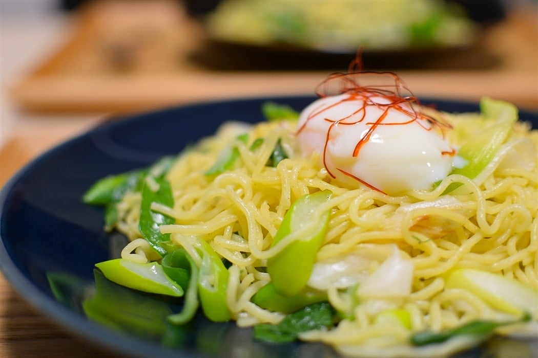 ねぎの青い部分をたっぷり使った塩焼きそばは、ねぎの旨みを最大限に引き立たせるお手軽メニューです。葉の部分は柔らかくとろ甘です。
