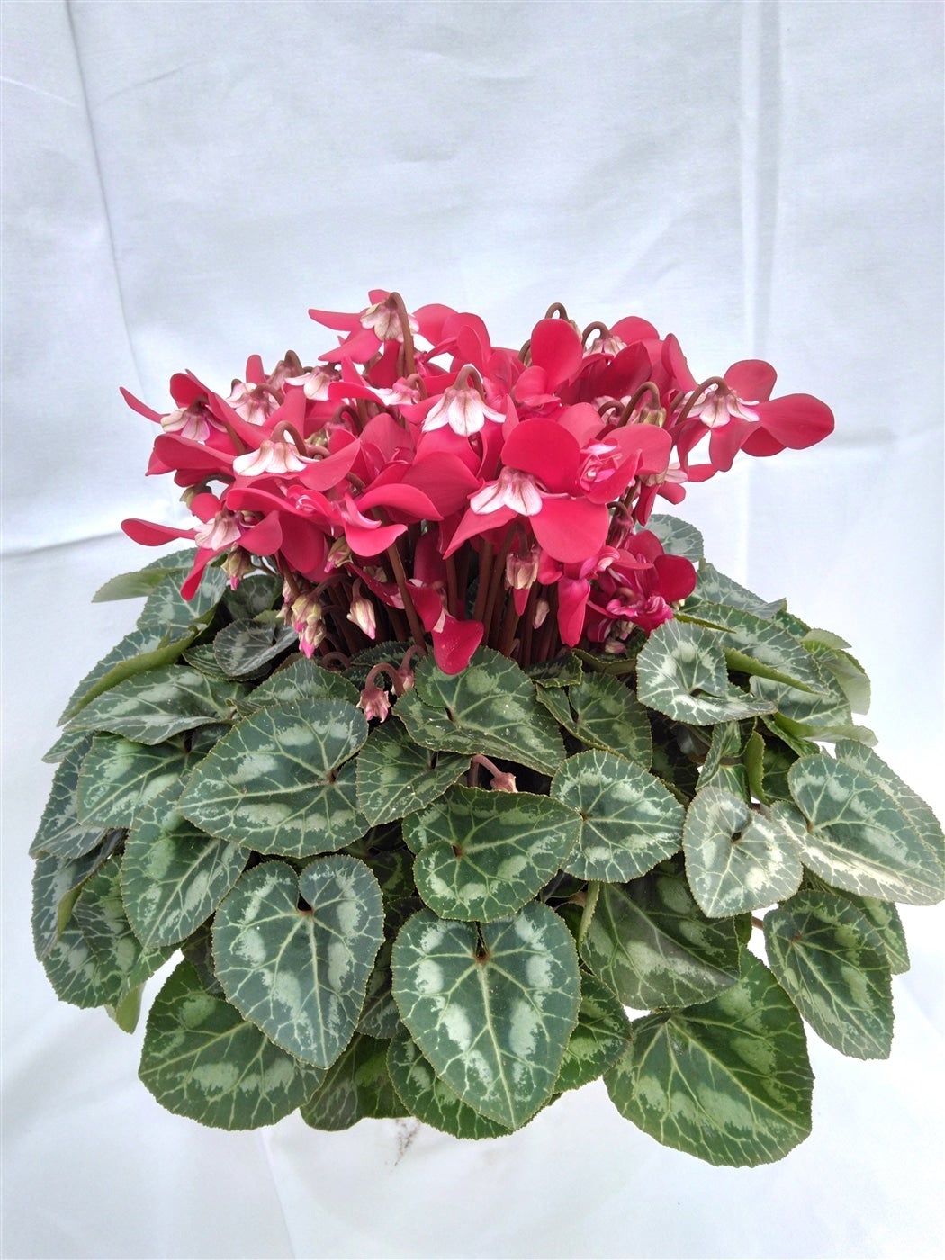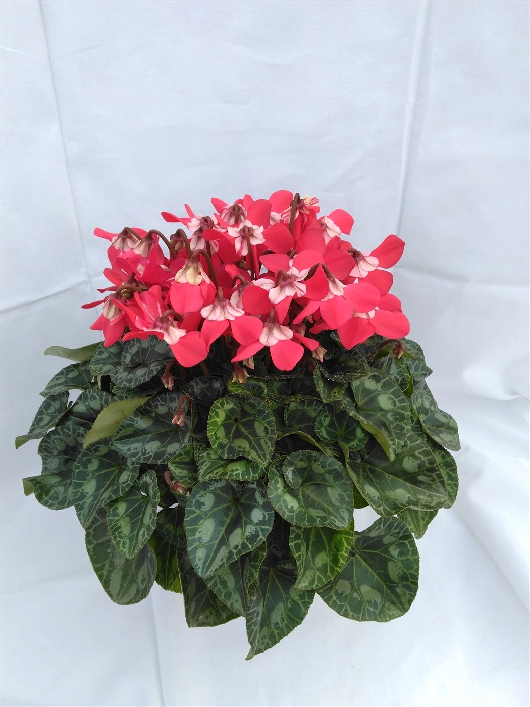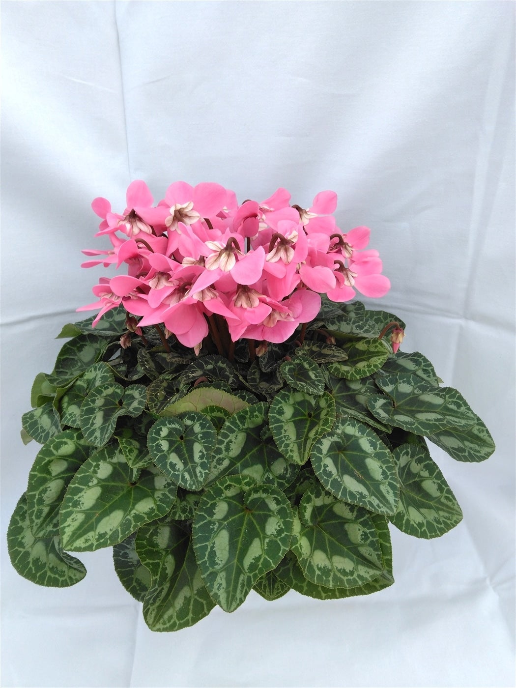 花弁が反転せず下向きに咲くユニークな花の形状と、傘をさしたような花姿が特徴のシクラメンです。