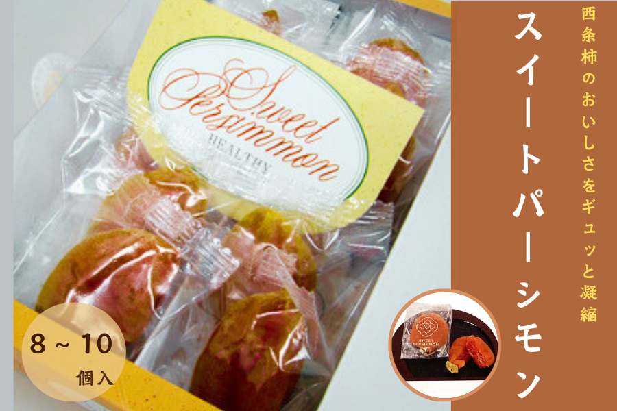 甘くて美味しい西条柿の旨味を凝縮した干し柿、スイートパーシモン。お茶受けにおすすめです。