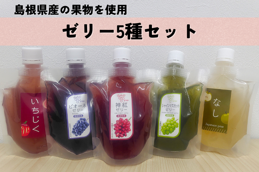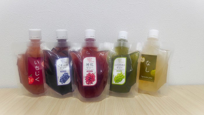島根県浜田市産のピオーネ、シャインマスカットや、いちじく(蓬莱柿)となし(赤梨)を使用したゼリー、島根県が新たに開発した品種「神紅」を使ったゼリーもあります。