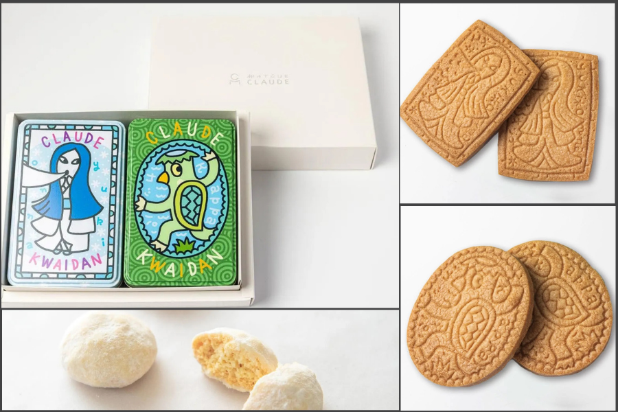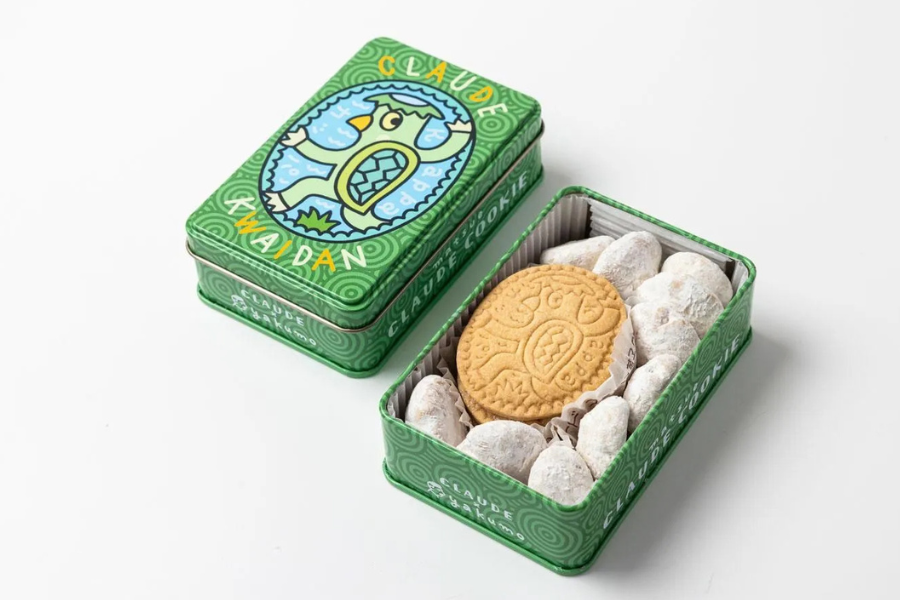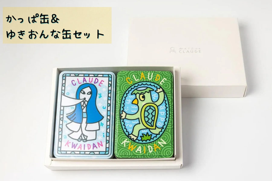河童・雪女のイラストの型抜きサブレと縁結びぼうるを缶につめました。