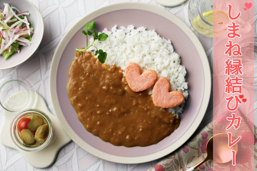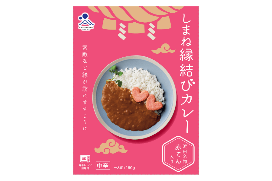 島根県浜田市の特産品の赤天(あかてん)を使用したカレーです。その赤天を誰にでも親しみやすい家庭的な味わいのカレーに合わせ、見た目も味も楽しめる一皿に仕上げました。縁結びの地・出雲にちなんだ「ハートの赤天」で、「人と人、人と地域のご縁が繋がりますように」そんな願いを込めた<しまねのご縁カレー>をぜひお召し上がりください。