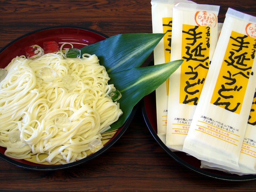 こちらの「つるつる手延べうどん」は、斐川町特産の「ひまわり」を自然の圧搾法でしぼったひまわり一番搾りオイルと斐川町産のコシヒカリを使い、三輪の創作麺師・六代目山下勝山氏監修、その技法によって誕生した『手延べうどん』です。
