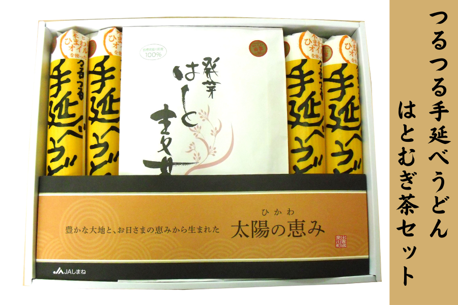 斐川町産のひまわり「つるつる手延べうどん」&「発芽はと麦茶」のセット