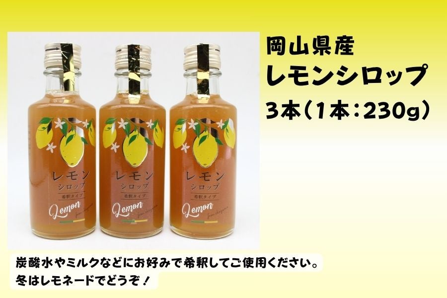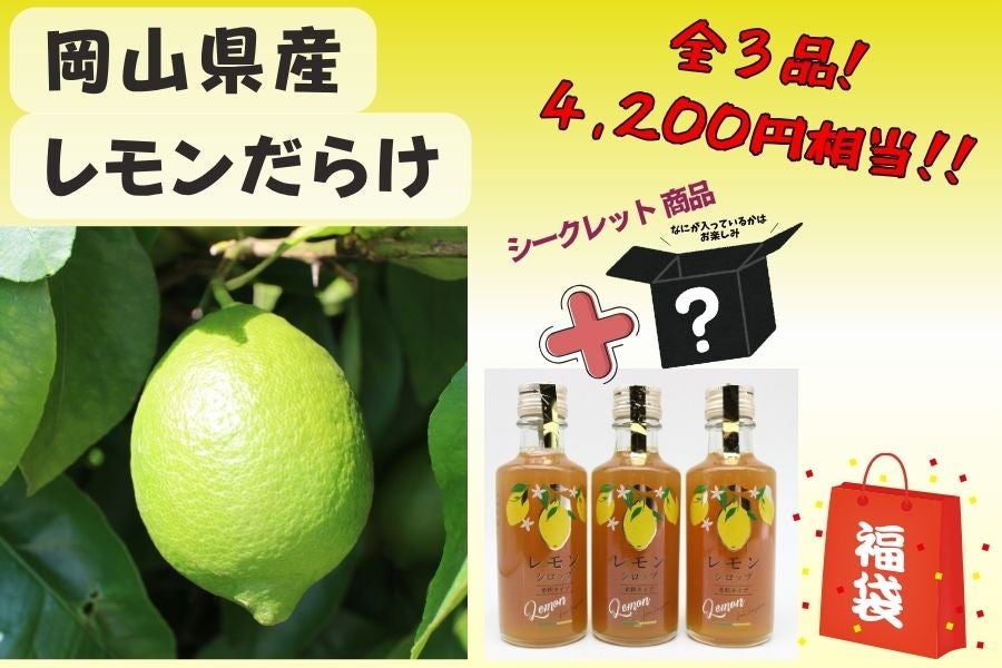 ・岡山県産レモン 1.0kg ・岡山県産レモンシロップ 230g×3本 ・シークレット商品(県産シロップ)×3本 計3品