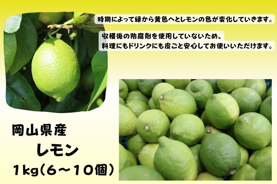 岡山県産レモンは収穫後の防腐剤を使用していないため、料理にもドリンクにも皮ごと安心してお使いいただけます。時期によって緑から黄色へとレモンの色が変化していきます。 多少のキズがありますが、食味上には問題ありません。