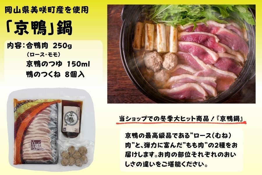 ・京鴨鍋:合鴨肉(ロース・モモ) 250g/京鴨のつゆ 150ml/鴨のつくね 8個入