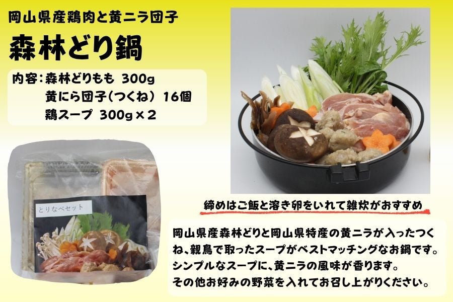 ・森林どり鍋:森林どりもも 300g/黄にら団子(つくね) 16個/鶏スープ 300g×2