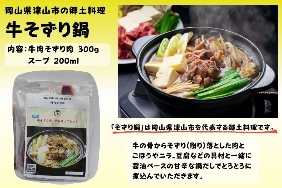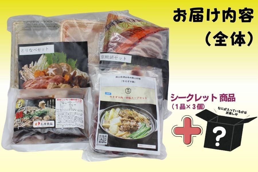 当ショップの冬季大ヒット商品「京鴨鍋」や高評価レビュー多数の「森林どり鍋」、津山市の郷土料理である「牛そずり鍋」に岡山の肉卸がつくる「もつ鍋」と色々な”おかやまの鍋”をお楽しみいただける『福袋』となっています。