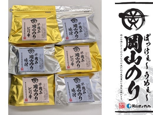 味付のり3袋、味付のり(ピリ辛)3袋の計6袋詰め合わせでご用意いたしました。朝食のお供としても大活躍する味付のり。岡山の海の恵みをたっぷり含んだ自慢ののりを、ぜひ大切な方への贈り物にどうぞ。