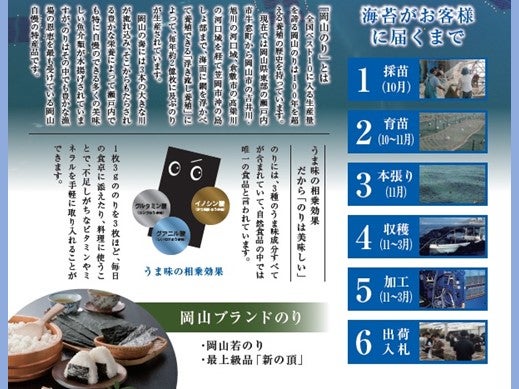 岡山のりは、百年を超える養殖の歴史を持っています。三つの大きな川が流れ込む岡山の栄養豊富な海で育つのりは、色・艶・風味ともに質が良く、岡山自慢の特産品です。大切な方への贈り物に「岡山のり」はいかがでしょうか。