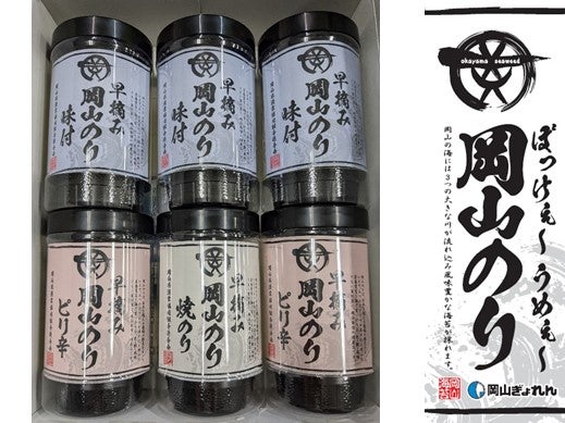 味付のり3個・味付のり(ピリ辛)2個・焼のり1個の計6個詰め合わせでお届けいたします。1箱で岡山のりを思う存分お楽しみいただける贅沢なセットです。贈り物に最適です。