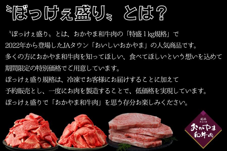 ぼっけぇ盛り≠ニは、おかやま和牛肉の「特盛1kg規格」で、2022年から登場したJAタウン「おいしいおかやま」の人気商品です。