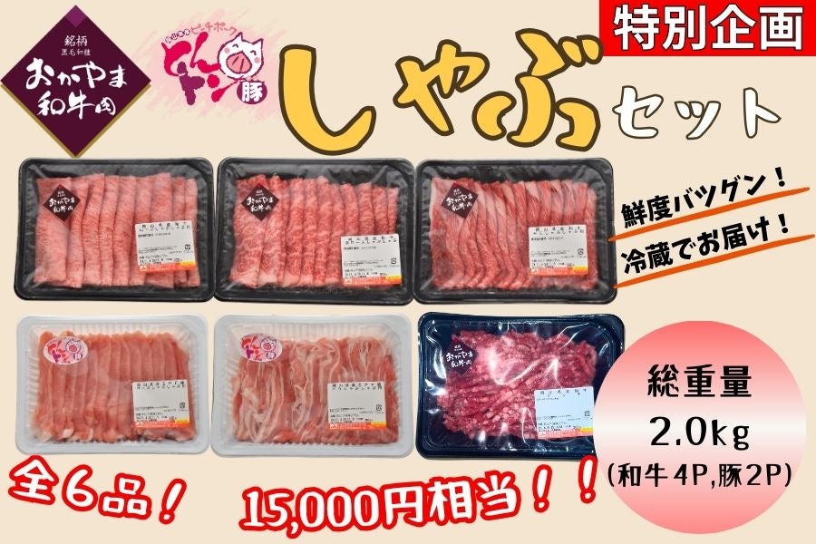 岡山県は”くだもの”だけじゃない…お肉も美味しいのをご存じですか?素晴らしき自然の恵みと人の技晴れの国おかやま≠ェ誇る『おかやま和牛肉』と「安心・美味しい・やわらかい」の3拍子揃い♪純おかやま育ち≠フSPF豚『ピーチポークとんトン豚』をしゃぶしゃぶセットにしました!あわせて6品、総重量2kgのとってもお買い得なセットとなっています!!大人数でしゃぶしゃぶするもよし♪一度に食べない場合は冷凍して、1種類ごとにちょっとずつ楽しむもよし♪しゃぶしゃぶ以外にもスライスの代わりとして、和牛ならすき焼きや牛丼の具、豚肉なら炒めものや豚汁にしてもOK!この機会に岡山の和牛肉×豚肉をご賞味ください♪