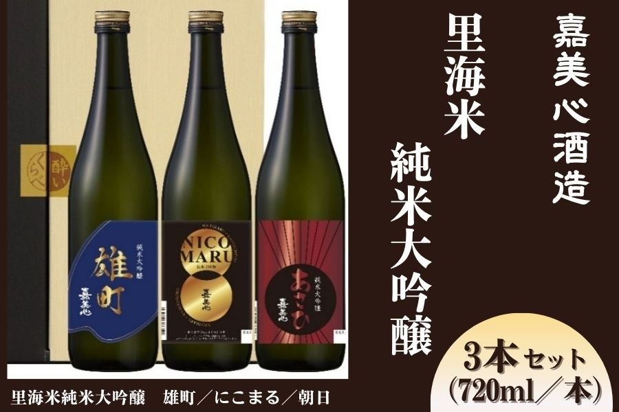 岡山県浅口市で100年以上の歴史をもつ『嘉美心酒造』。こちらは里海米使用の純米大吟醸720mlの3本セットです。