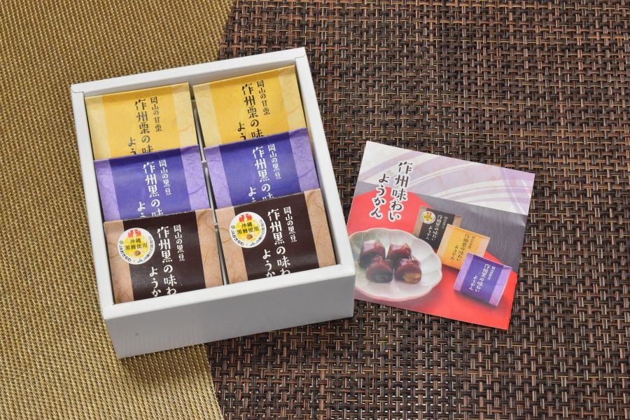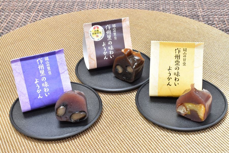 岡山の黒大豆「作州黒」と沖縄県特産の黒糖を組み合わせてできたようかんです。黒糖の風味と作州黒の風味がふんわりと感じられるほどよい甘さをお楽しみください。