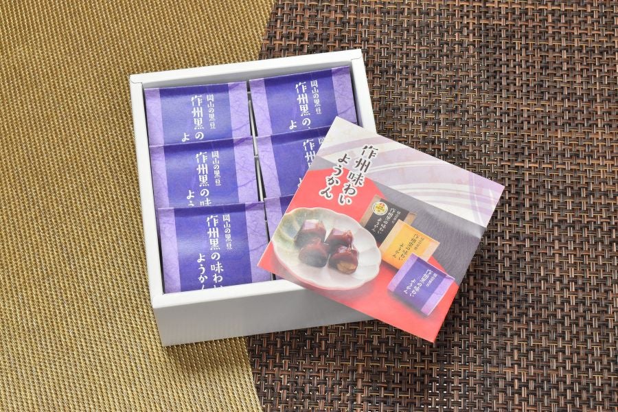 岡山県勝英地域の大粒黒大豆を使用したようかんです。大粒で美味しい作州黒の密煮を大納言小豆の餡で包み込みました。