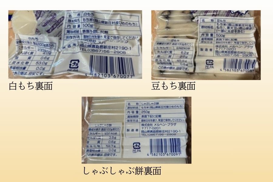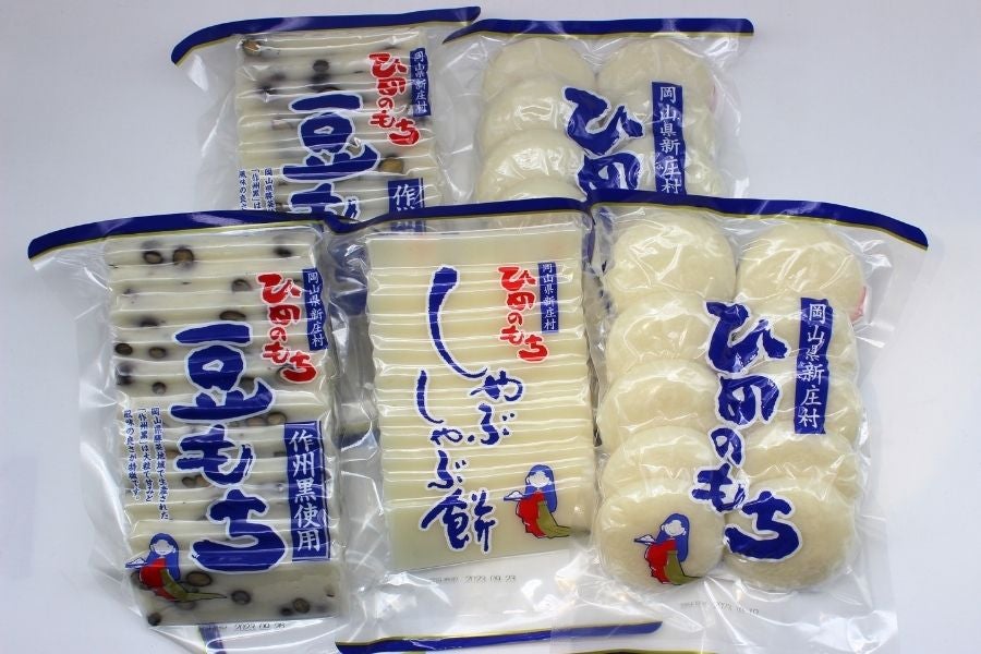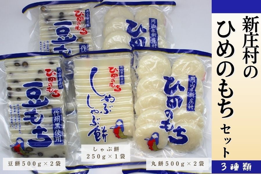 <内容> 丸もち 500g×2袋 豆餅  500g×2袋 しゃぶ餅250g×1袋 <原材料名> もち米(岡山県新庄村産ひめのもち)