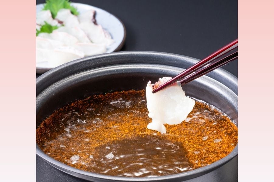 岡山の桃を餌として育った桃鯛をスライスに!桃鯛の出汁がしっかり利いた専用スープでしゃぶしゃぶしてお召し上がりください♪