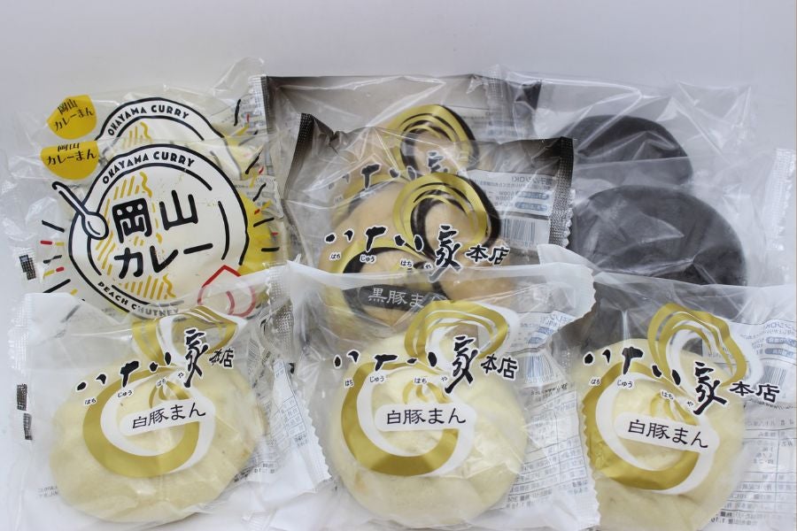 <内容> 白豚まん×3、黒豚まん×2、岡山だらけまん×2、岡山カレーまん×2 <原材料名> 白豚まん:小麦粉(国内製造)、豚肉、玉葱、砂糖、醤油、バター、清酒、イースト菌、味醂、中華調味料、ごま油、食塩 /トレハロース、調味料(アミノ酸等)、保存料(安息香酸Na)(一部に乳成分・大豆・小麦・牛肉・ごま・ゼラチン・豚肉・鶏肉を含む) 黒豚まん:小麦粉(国内製造)、豚肉、黒糖、玉葱、醤油、清酒、味醂、砂糖、バター、イースト菌、片栗粉 /トレハロース、保存料(安息香酸Na)(一部に乳成分・小麦・豚肉・大豆を含む) 岡山だらけまん:小麦粉(国内製造)、もち米、筍、たこ、大根、砂糖、バター、イースト菌、イカスミ、デキストリン、食塩、風味調味料(かつお節粉末、かつおエキス)、醤油、/トレハロース、調味料(アミノ酸等)、(一部に乳成分・大豆・小麦を含む) 岡山カレーまん:小麦粉(国内製造)、牛肉、玉葱、白桃チャツネ、人参、砂糖、トマトペースト、バター、イースト菌、食用油脂、ターメリック、ニンニク、カレーパウダー、香辛料、食塩、/トレハロース、増粘剤(加工でんぷん、タピオカ)、調味料(アミノ酸等)、クエン酸、保存料(安息香酸Na)、酸化防止剤(ビタミンC)、(一部に乳成分・大豆・小麦・ごま・牛肉・ももを含む) <保存方法> 要冷凍(-18℃以下)