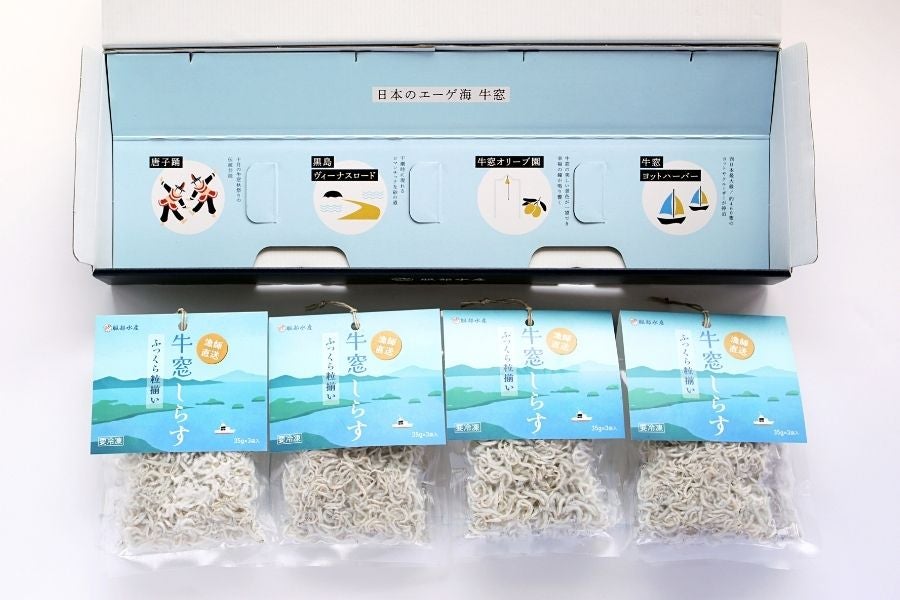 35g×3の牛窓しらすが4つ入りで、心ゆくまで牛窓しらすの美味しさをご堪能いただけます。牛窓らしさいっぱいの専用ギフトボックス入りで、大切な人や懐かしい人への贈り物としても最適です。