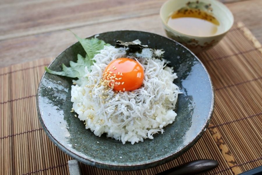 2.ご飯が隠れるくらい”しらす”を盛り付け、真ん中をくぼませて卵黄を落とす