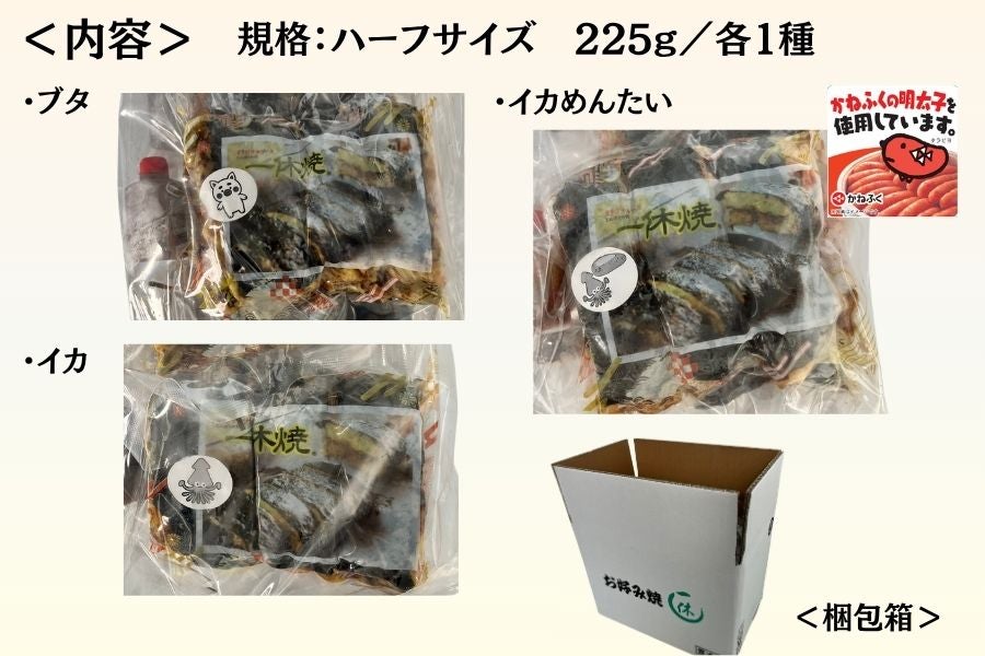 <内容> 一休焼 3種ハーフサイズ(ブタ/イカ/イカめんたい 各225g)×3個ずつ <原材料名> ・ブタ 【お好み焼き】キャベツ(国産)、小麦粉(国内製造)、豚肉(国内産又はオランダ産又はその他)、卵(国産)、焼きのり(国内製造)、削り節(いわし、さば)、天かす(国内製造)/増粘剤(グァーガム、ペクチン)、膨張剤製剤 【ソース】マヨネーズ(国内製造)、野菜、果実(トマト、デーツ、たまねぎ、りんご、その他)、糖類(ぶどう糖果糖液糖、砂糖)、醸造酢、アミノ酸液、食塩、醤油、香辛料、オイスターエキス、砂糖加工品(砂糖、醸造酢)、肉エキス、酵母エキス、昆布、蛋白加水分解物、しいたけ/増粘剤(加工でんぷん、増粘多糖類)、調味料(アミノ酸等)、カラメル色素、甘味料(甘草、サッカリンNa)、(一部に小麦・卵・大豆・鶏肉・豚肉・いか・さば・もも・りんごを含む) ・イカ 【お好み焼き】キャベツ(国産)、小麦粉(国内製造)、イカ(ペルー産)、卵(国産)、焼きのり(国内製造)、削り節(いわし、さば)、天かす(国内製造)/増粘剤(グァーガム、ペクチン)、膨張剤製剤 【ソース】マヨネーズ(国内製造)、野菜、果実(トマト、デーツ、たまねぎ、りんご、その他)、糖類(ぶどう糖果糖液糖、砂糖)、醸造酢、アミノ酸液、食塩、醤油、香辛料、オイスターエキス、砂糖加工品(砂糖、醸造酢)、肉エキス、酵母エキス、昆布、蛋白加水分解物、しいたけ/増粘剤(加工でんぷん、増粘多糖類)、調味料(アミノ酸等)、カラメル色素、甘味料(甘草、サッカリンNa)、(一部に小麦・卵・大豆・鶏肉・いか・さば・もも・りんごを含む) ・イカめんたい 【お好み焼き】キャベツ(国産)、小麦粉(国内製造)、イカ(ペルー産)、卵(国産)、焼きのり(国内製造)、削り節(いわし、さば)、天かす(国内製造)、すけとうだらの卵(米国又はロシア)、唐辛子/増粘剤(グァーガム、ペクチン)、膨張剤製剤 【ソース】マヨネーズ(国内製造)、野菜、果実(トマト、デーツ、たまねぎ、りんご、その他)、糖類(ぶどう糖果糖液糖、砂糖)、醸造酢、アミノ酸液、食塩、醤油、香辛料、オイスターエキス、砂糖加工品(砂糖、醸造酢)、肉エキス、酵母エキス、昆布、蛋白加水分解物、しいたけ/増粘剤(加工でんぷん、増粘多糖類)、調味料(アミノ酸等)、カラメル色素、甘味料(甘草、サッカリンNa)、(一部に小麦・卵・大豆・鶏肉・いか・さば・もも・りんご・ゼラチンを含む) <保存方法> 要冷凍(-18℃以下) <賞味期限> 製造日より180日