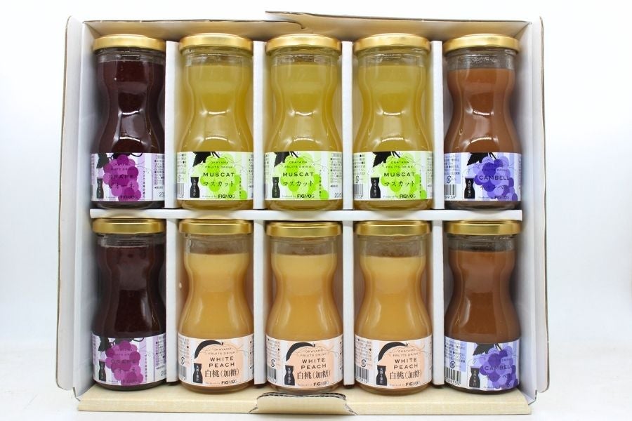 <内容>1本100ml 〇白桃×3本 〇マスカット・オブ・アレキサンドリア×3本 〇ピオーネ×2本 〇キャンベル×2本 <原材料名> 白桃:もも(岡山県産)、てんさい糖/酸化防止剤(ビタミンC) マスカット・オブ・アレキサンドリア:ぶどう(マスカット)(岡山県産)、/酸化防止剤(ビタミンC) ピオーネ:ぶどう(ピオーネ)(岡山県産)/酸化防止剤(ビタミンC) キャンベル:ぶどう(キャンベル・アーリー)(岡山県産)/酸化防止剤(ビタミンC)