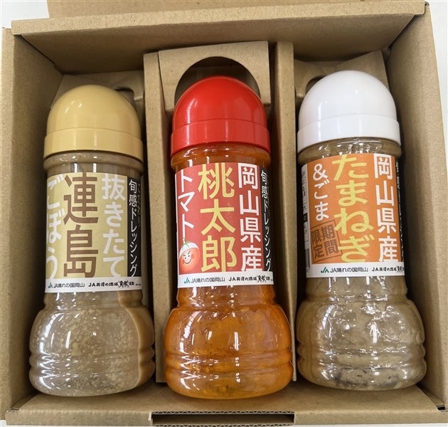 【岡山県産桃太郎トマトのドレシング】 岡山県産の桃太郎トマトをたっぷり使用しました。甘味と酸味、旨味のバランスがとれた桃太郎トマトのおいしさを存分に楽しめます。 【たまねぎ&こまのドレッシング】 瀬戸内海で育った牡蠣の殻に含まれている”豊かなミネラル成分”を圃場に入れ土づくり海と土の循環型農法で育てた里海タマネギを贅沢に使いました。本醸造醤油と酢を絶妙にブレンドし、焙煎ごまを加えてマイルドな味付けにした万能タイプのドレッシングです。 商品詳細 〈商品名〉 岡山県産桃太郎トマトのドレッシング 〈名 称〉 分離液状ドレッシング 〈原材料〉 トマト(岡山県産)、醸造酢、食用植物油脂(大豆、ごまを含む)、玉葱、砂糖、塩、ニンニク、ゆず果汁、黒胡椒、バジル 〈内容量〉 200ml(1本) 〈賞味期限〉 商品に記載(製造から6ヶ月) 〈保存方法〉 直射日光を避け常温で保存してください。開栓後は冷蔵庫に保存して、なるべく早くお召し上がりください。 〈製造者〉 有限会社 曲江春 岡山県倉敷市中庄3126-8 〈商品名〉 倉敷市連島産抜きたてごぼうドレシング 〈名 称〉 分離液状ドレッシング 〈原材料〉 玉葱(岡山県産)、食用植物油脂(大豆を含む)、醸造酢、砂糖、醤油(小麦・大豆を含む)、ゴボウ(倉敷市産)塩/調味料(アミノ酸) 〈内容量〉 200ml(1本) 〈賞味期限〉 商品に記載(製造から6ヶ月) 〈保存方法〉 直射日光を避け常温で保存してください。開栓後は冷蔵庫に保存して、なるべく早くお召し上がりください。 〈製造者〉 有限会社 曲江春 岡山県倉敷市中庄3126-8 商品詳細 〈商品名〉 タマネギ&ごまドレシング 〈名称〉 分離液状ドレッシング 〈原材料〉 玉葱(岡山県産)、醸造酢、食用植物油脂(大豆、ごまを含む)、砂糖、醤油(小麦大豆を含む)塩、鰹節粉末、昆布粉末、ゴマ、柚子果汁、黒コショウ/調味料(アミノ酸) 〈内 容 量〉 200ml(1本) 〈賞味期限〉 商品に記載(製造から6ヶ月) 〈保存方法〉 直射日光を避け常温で保存し開栓後は冷蔵庫(1〜10℃)に保存して、なるべく早くお召し上がりください。 〈製造者〉 有限会社 曲江春 岡山県倉敷市中庄3126-8 〈使用上の注意〉 増粘剤など添加物を使用していないため分離致しますのでよく振ってからご使用ください。尚製品に含まれる黒色の粒は、黒胡椒ですので、安心してお召し上がり下さい。