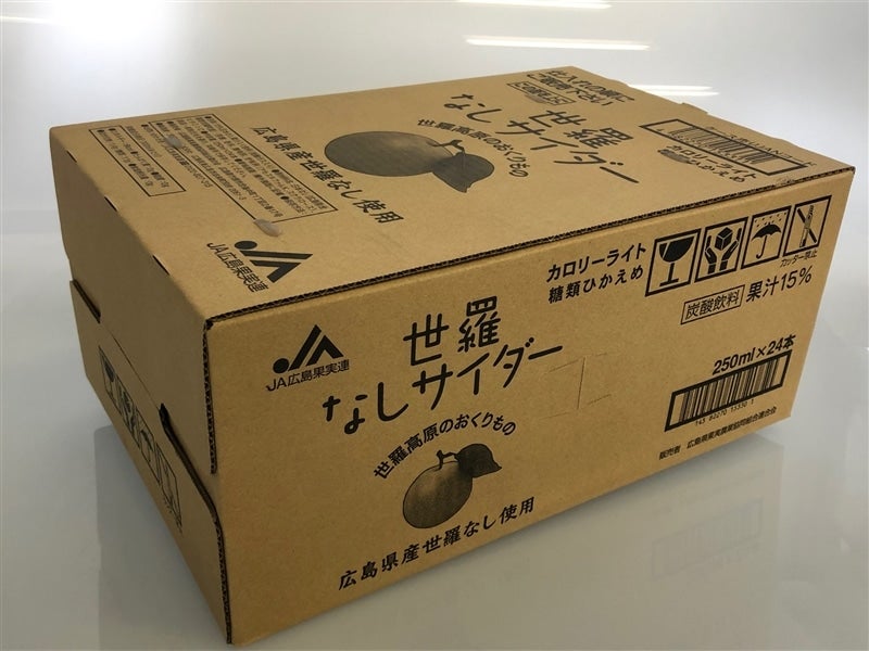 広島 世羅なしサイダー 250ml×24本入り 広島県の世羅梨の果汁を使用した梨果汁入り炭酸飲料です。 広島の秋を代表する特産果実「世羅なし」を丸ごと搾ってサイダーにしました。 その名も「世羅なしサイダー」です。 世羅郡世羅町は約半世紀の歴史がある梨の名産地。 代表品種は「幸水」「豊水」です。 いずれも冷涼な世羅高原に育まれた特産で、 爽やかな甘味とやさしい酸味とのバランス良い赤梨です。 「世羅なしサイダー」は、そんな「世羅なし」の風味が 楽しめるように工夫しました。 <名 称>15%日本なし果汁入り飲料(炭酸ガス入り) <内容量>250ml <原材料名>日本なし(広島県世羅郡世羅町産)/炭酸、香料、酸味料、甘味料(アセスルファムK、スクラロース)、ビタミンC <保存方法>高温・直射日光を避け、冷暗所で保存してください。 <賞味期限>製造日より10ヵ月